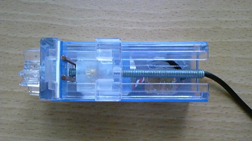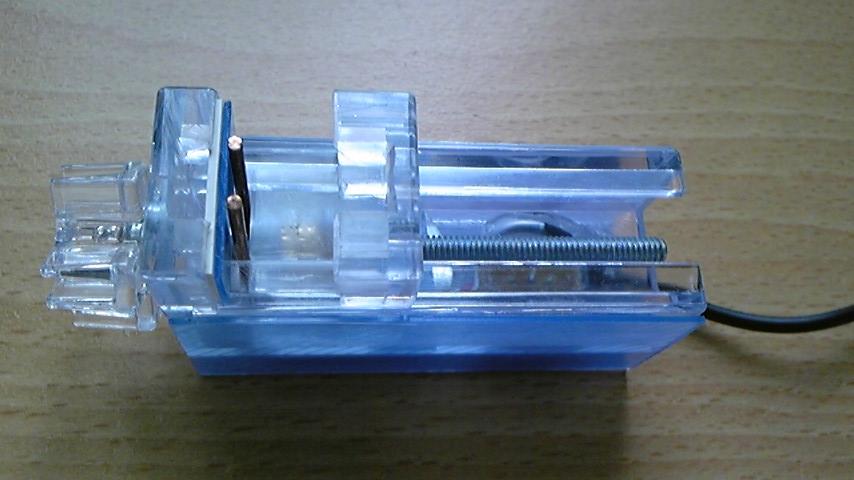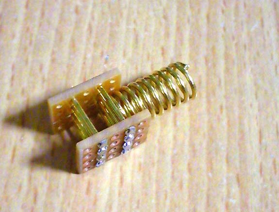 ユニバーサル基板を真鍮針金で Ⅱに半田付けし、真鍮針金で作ったばねでムーブメントを押える。