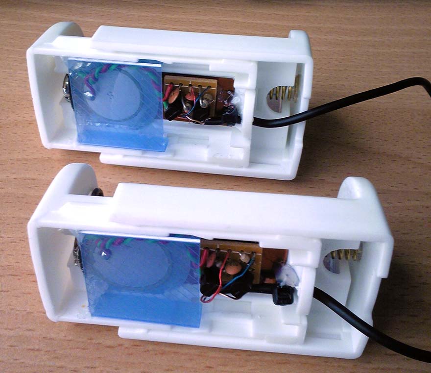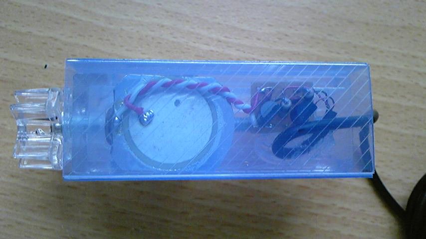 内蔵アンプのトランジスタ(S9014)とコンデンサ(0.01μF)は防犯ブザーから取り出したもの。