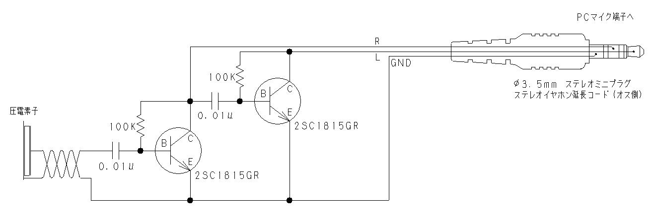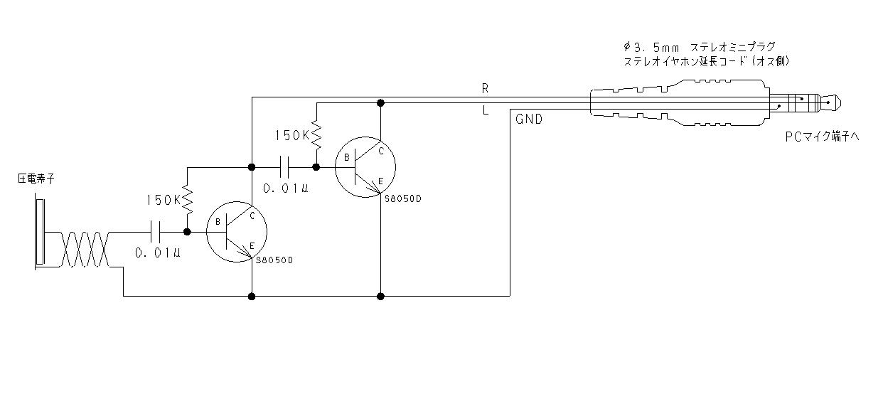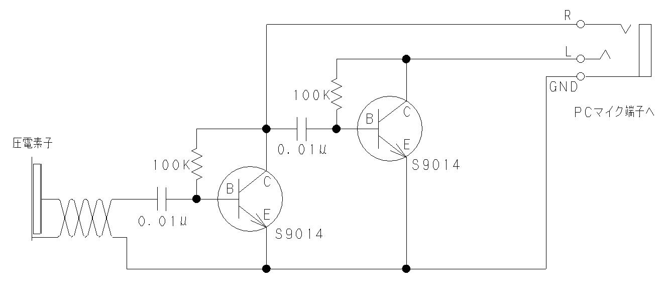 圧電素子は100均の防犯ブザーから取り出したのもを使用。