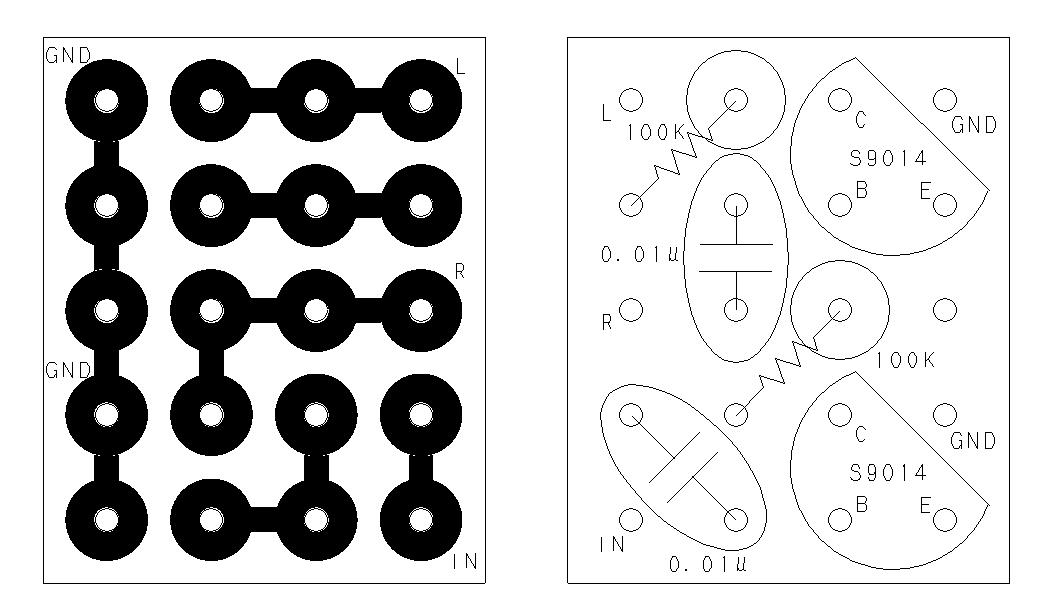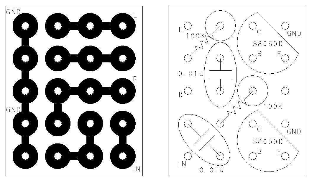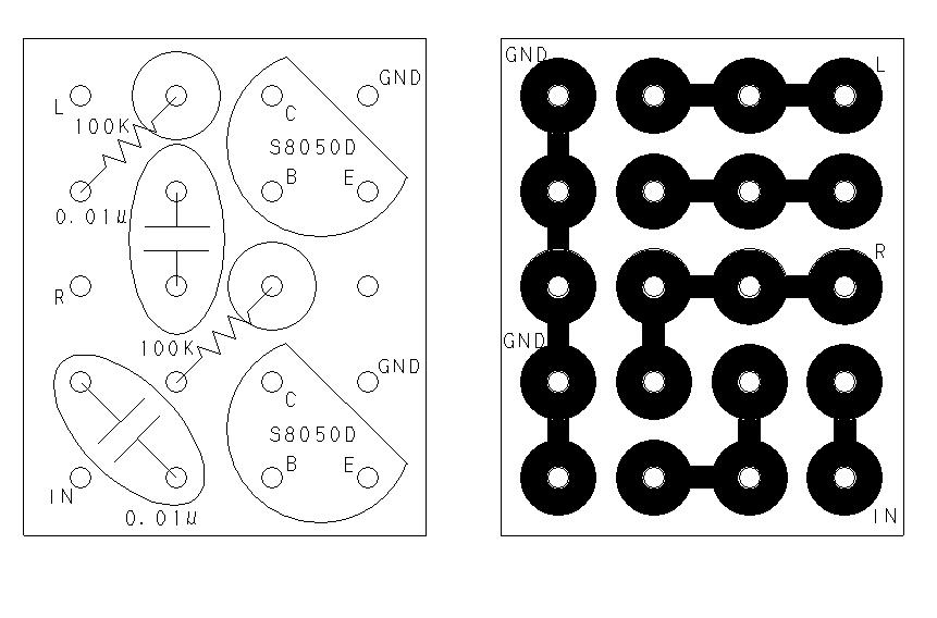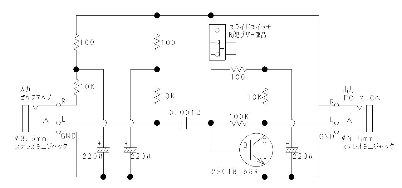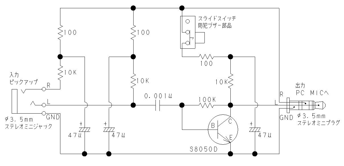 内蔵アンプは防犯ブザー2台から取った トランジスタ(S8050D) コンデンサ(103=0.01μF) 抵抗(150kΩ) を使い、基板も防犯ブザーの基板を切り出し 穴あけしたもの。