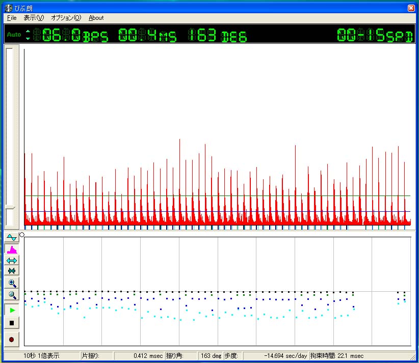1カウント 17ステップ を 18ステップ に増やし、測定回数18回( 18刻音分 )で歩度、片振り時間、振動数を表示 に変更。