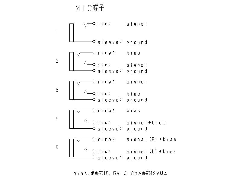 上図の 1 は プラグインパワー非対応 のモノラル 5 はステレオ で これらの方式はPC には実際には 無い と思われる。