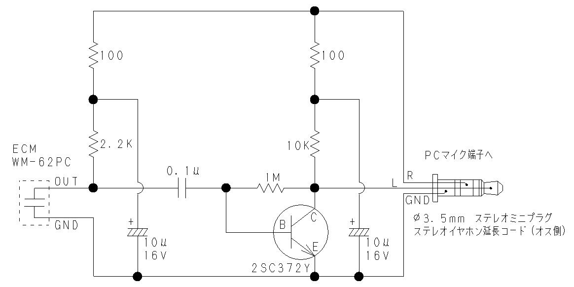 パソコンのプラグインパワーをそのまま使うのではなく、CRで平滑し、マイクカプセル(ECM)のインピーダンスに合わせたプルアップ抵抗にしている。